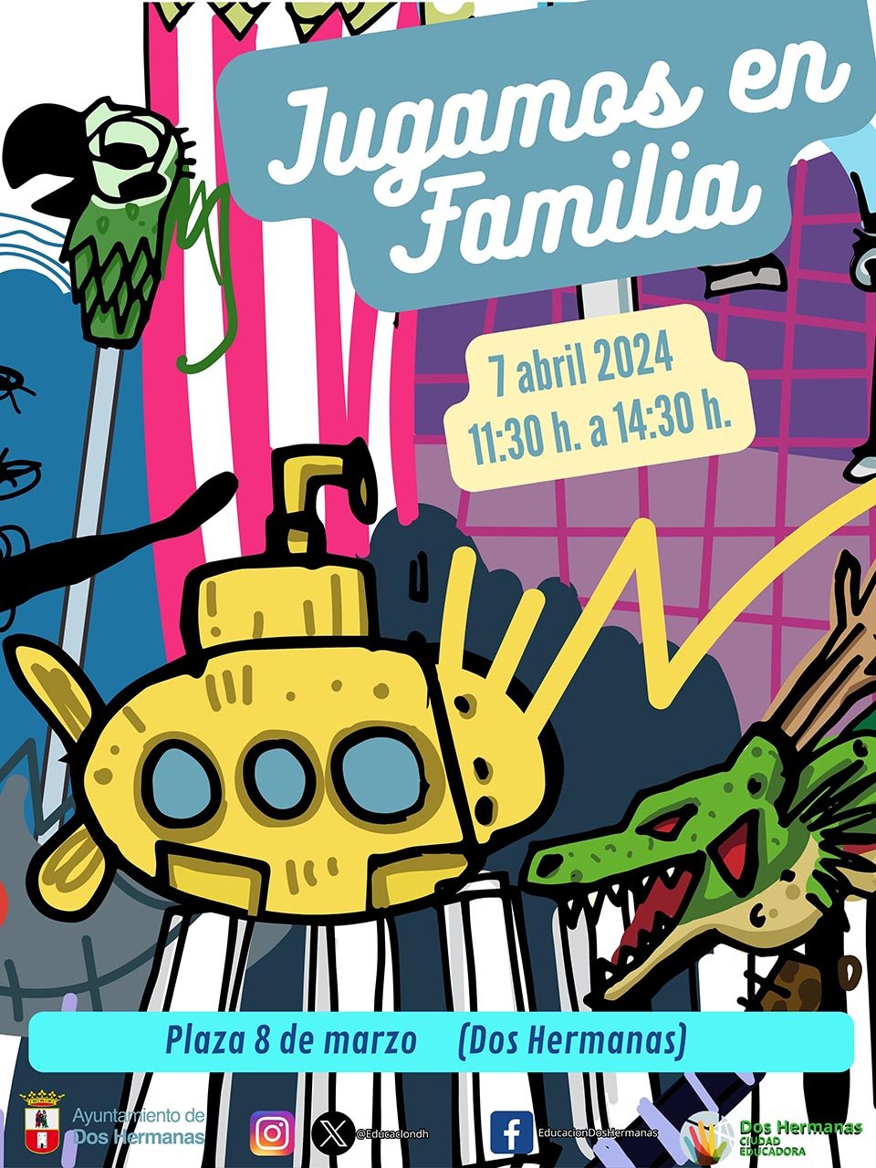 El próximo domingo 7 de abril de 2024 de 11:30 horas a 14:30 horas celebramos nueva edición de Jugamos en Familia en Plaza 8 de marzo. Te invitamos a disfrutar de las actividades que hemos preparado para el evento: