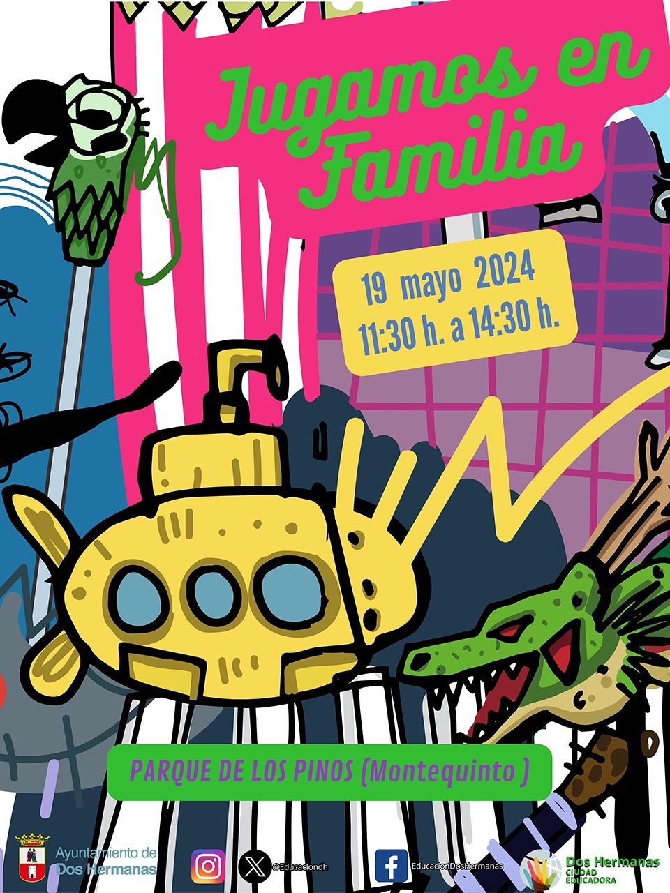 El próximo domingo 19 de mayo de 2024 de 11:30 horas a 14:30 horas celebramos nueva edición de Jugamos en Familia en Parque de Los Pinos (Montequinto). Te invitamos a disfrutar de las actividades que hemos preparado para el evento.