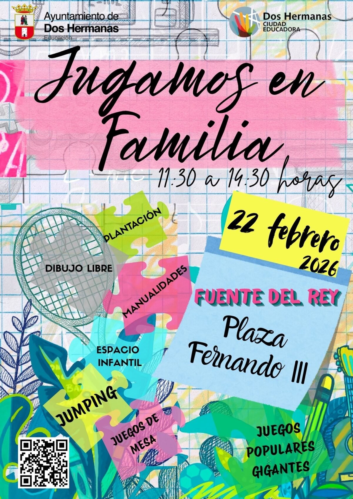 El próximo domingo 22 de febrero de 2026, de 11:30 a 14:30 horas, celebramos una nueva edición de “Jugamos en Familia”, en Bda. Fuente del Rey, Plaza Fernando III (junto a Piscina Municipal), una jornada gratuita para disfrutar en comunidad, organizada por la Delegación de Educación del Ayuntamiento de Dos Hermanas.